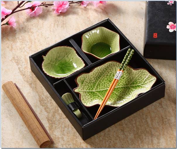 清单:叶形盘一个,叶形调味碟一个,六角小碗一个,环保木筷一双,筷子架一只