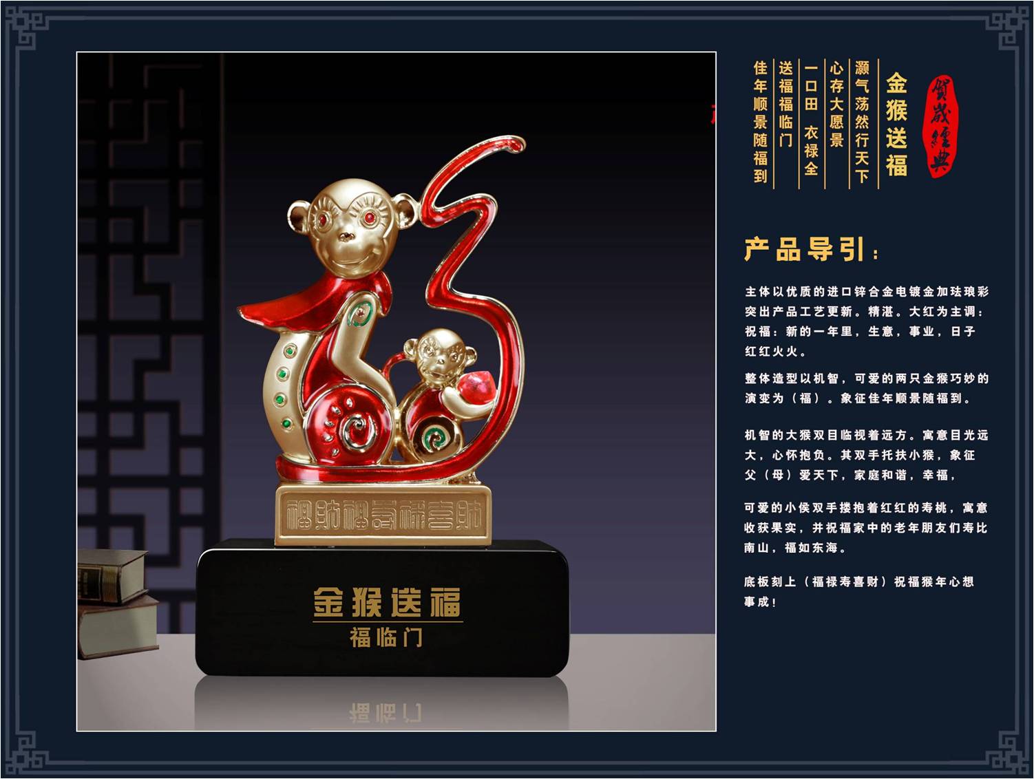 产品介绍:主体以优质的进口锌合金+珐琅彩突出产品工艺精湛,大红为主调,祝福新的一年里生意、事业、日子红红火火。 整体造型以机智、可爱的两只金猴巧妙的演变成“福”字象征佳年顺景随福到